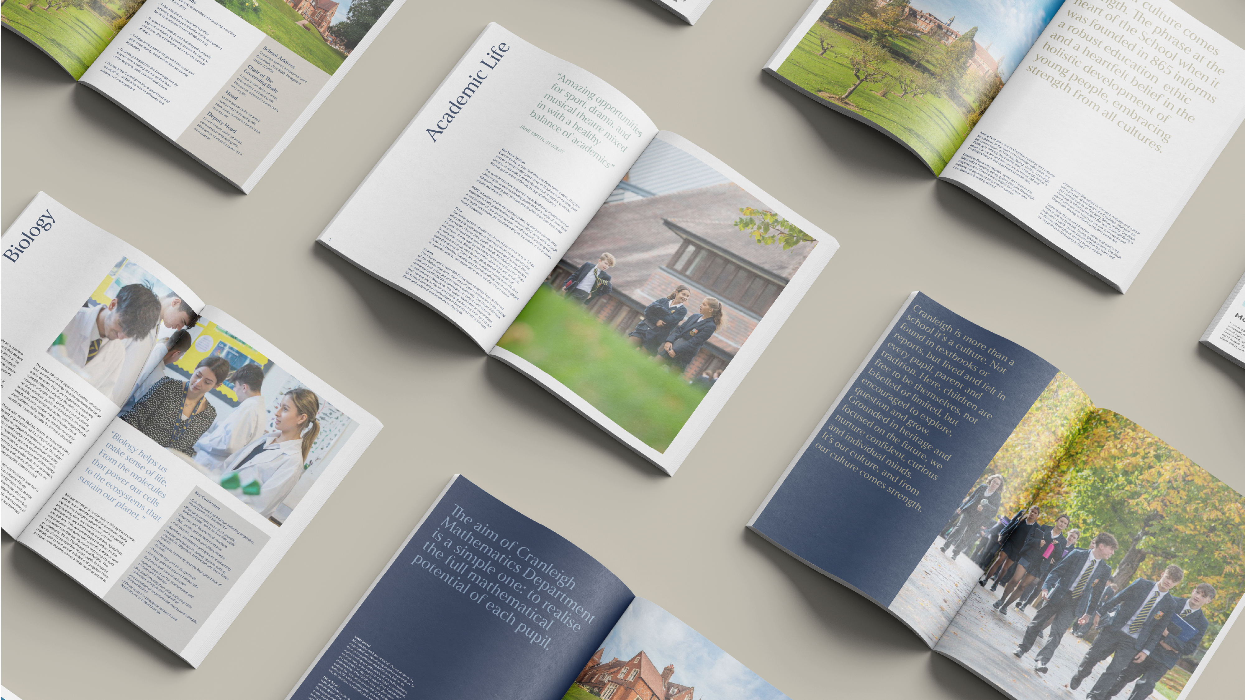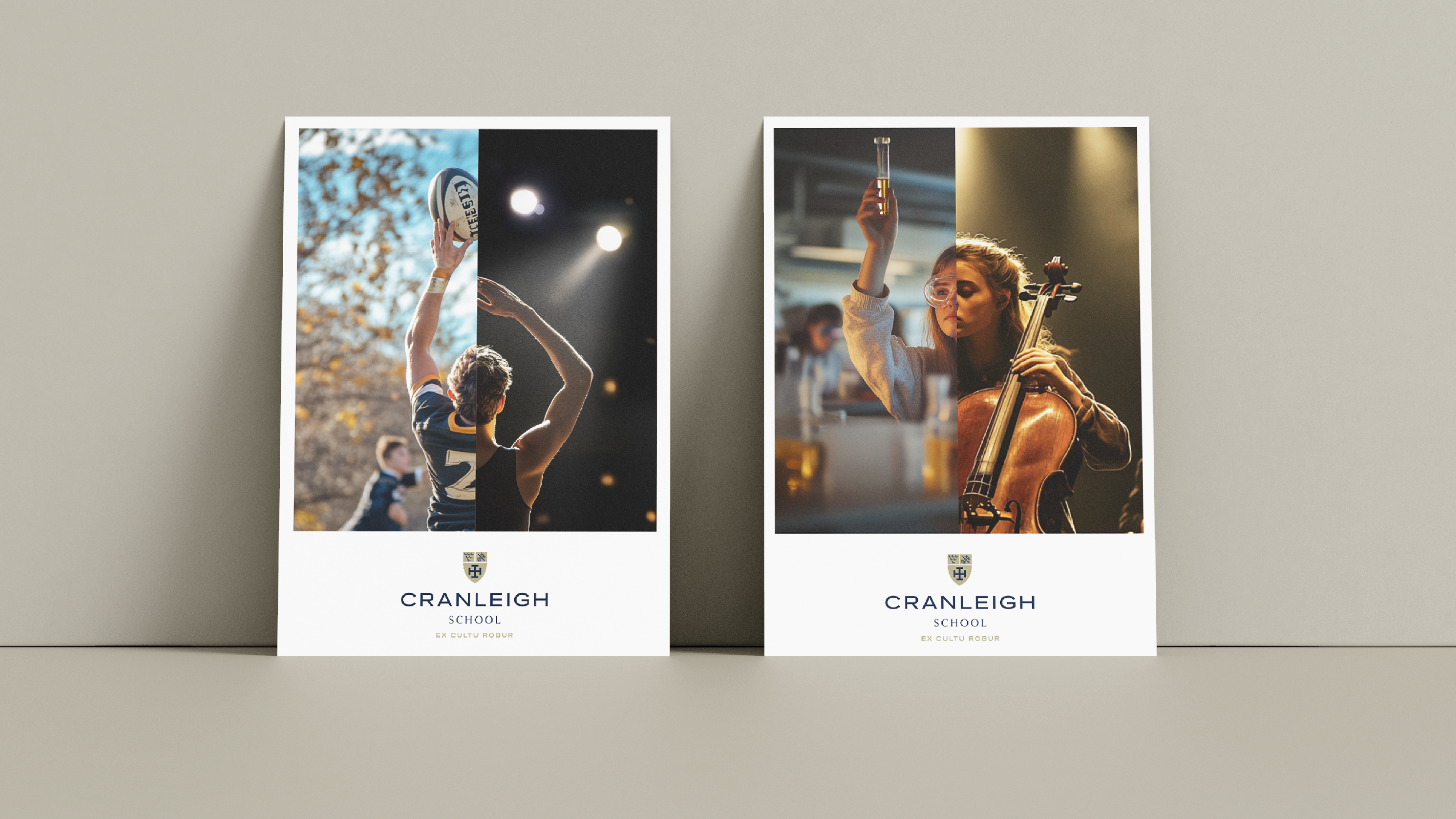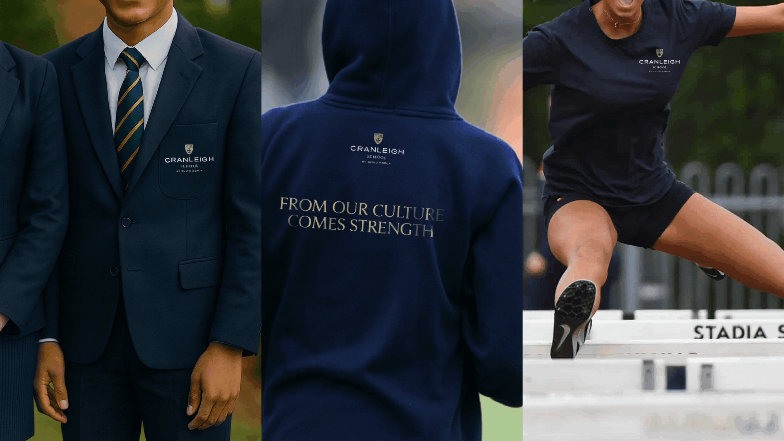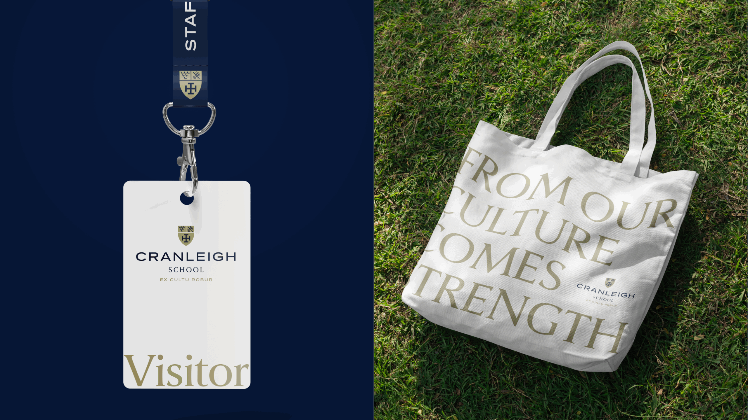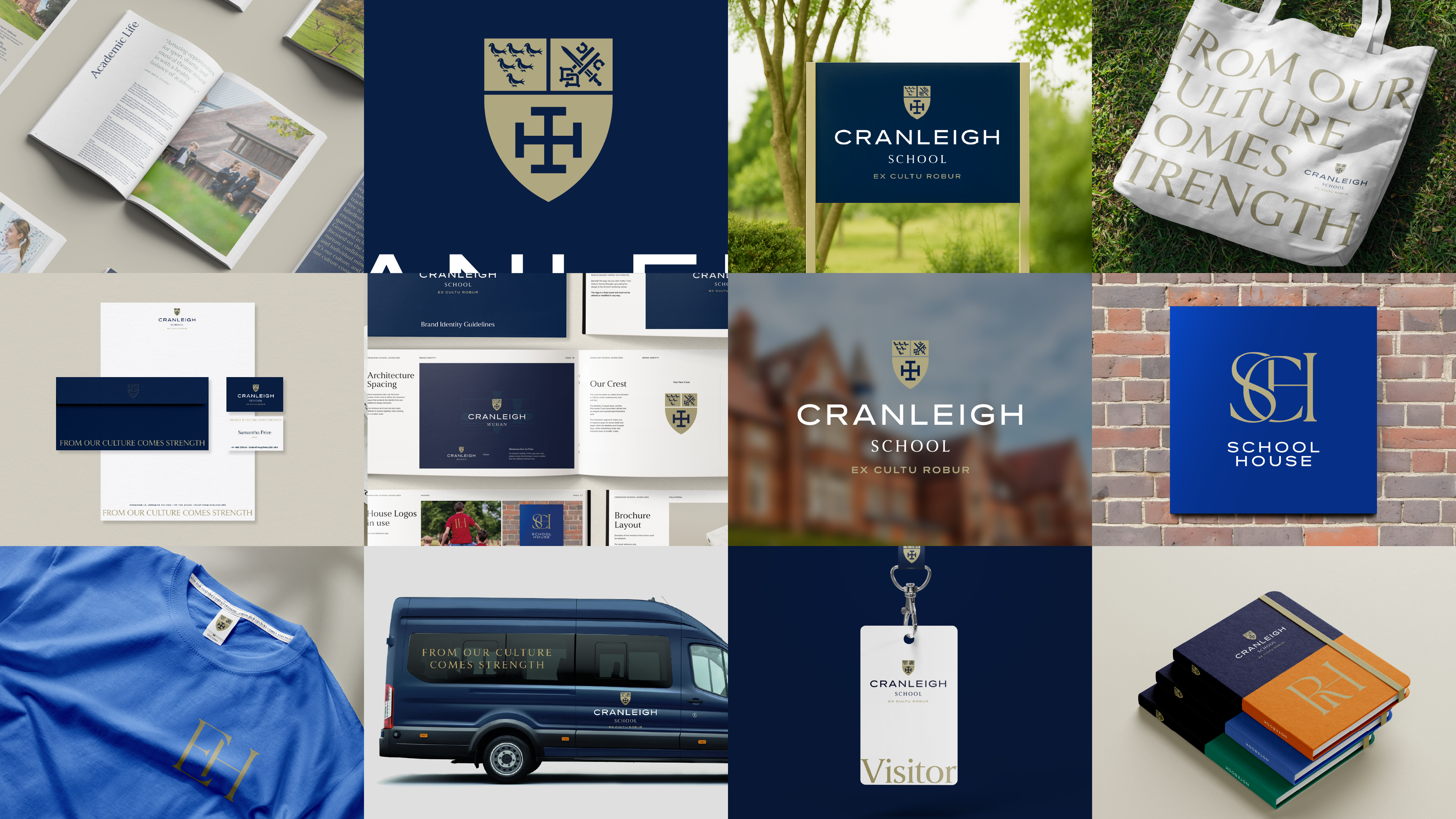 This modernised crest was paired with an evolved interpretation of the school’s motto, Ex Cultu Robur. By shifting the translation from “From culture comes strength” to “From our culture comes strength”, the phrase becomes anchored in the lived experiences of Cranleigh’s students, teachers and wider community – making a historic motto feel owned and relevant today.